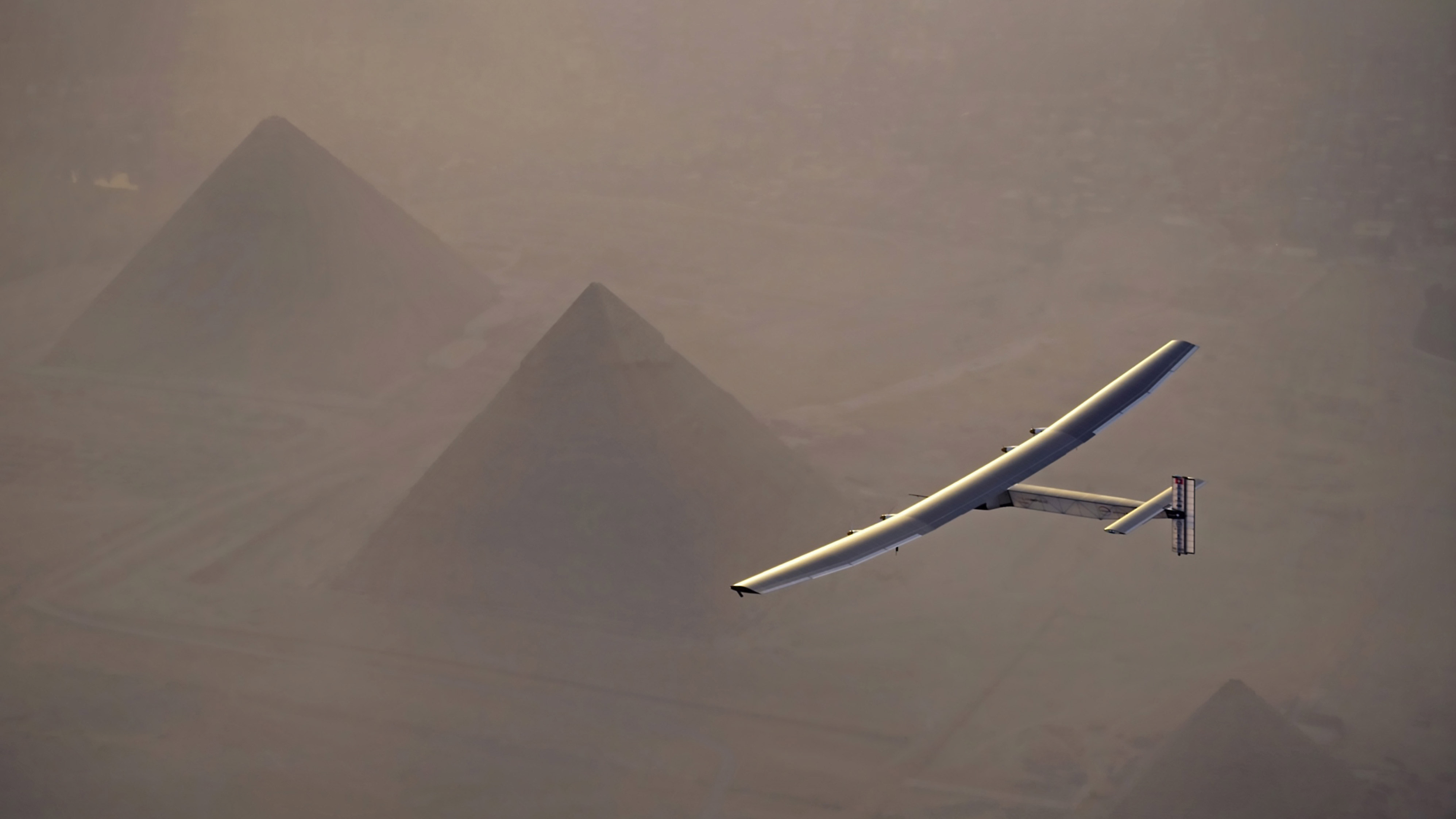 Solar Impulse 2 flying over the pyramids in Giza, 埃及 (© Jean Revillard/Solar Impulse2 via 盖蒂图片社)